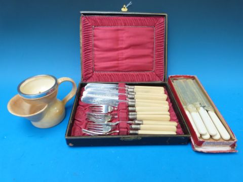 A silver mounted George Jones shaving mug, cased and boxed cutlery etc