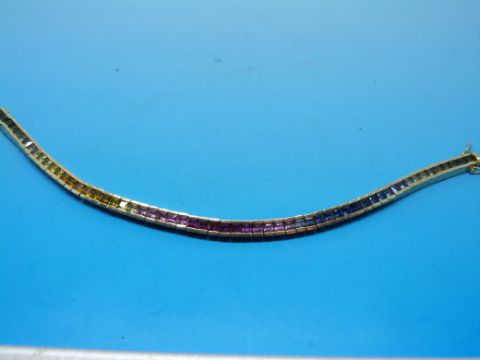 A yellow metal tennis bracelet set with sapphires in a full spectrum of colours