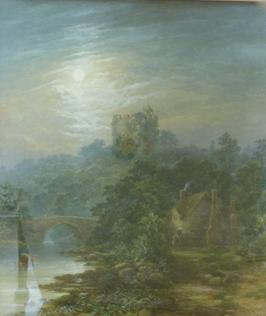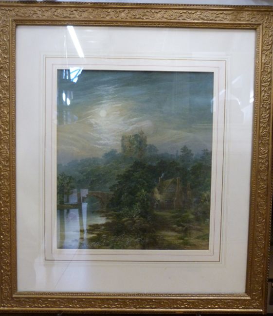 A late 19thC watercolour of a moonlit landscape with river, bridge and a folly to hill behind (38x33cm) indistinctly signed and dated 1897 lower left