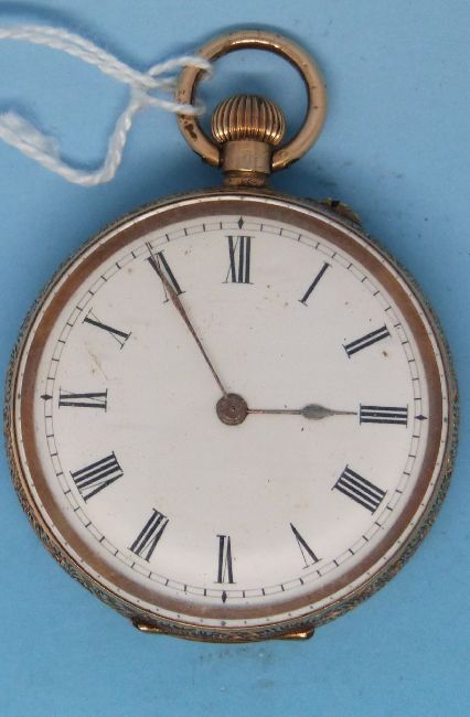 A yellow metal pocket watch with ornate engraving, enamel face and Roman numerals, the case marked 14k
