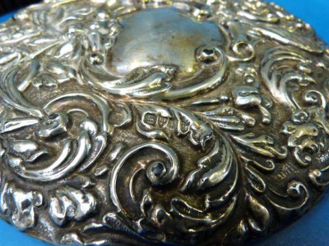 A hallmarked silver embossed dressing table set comprising hand mirror, three various brushes, button hook and a glass dressing table bottle