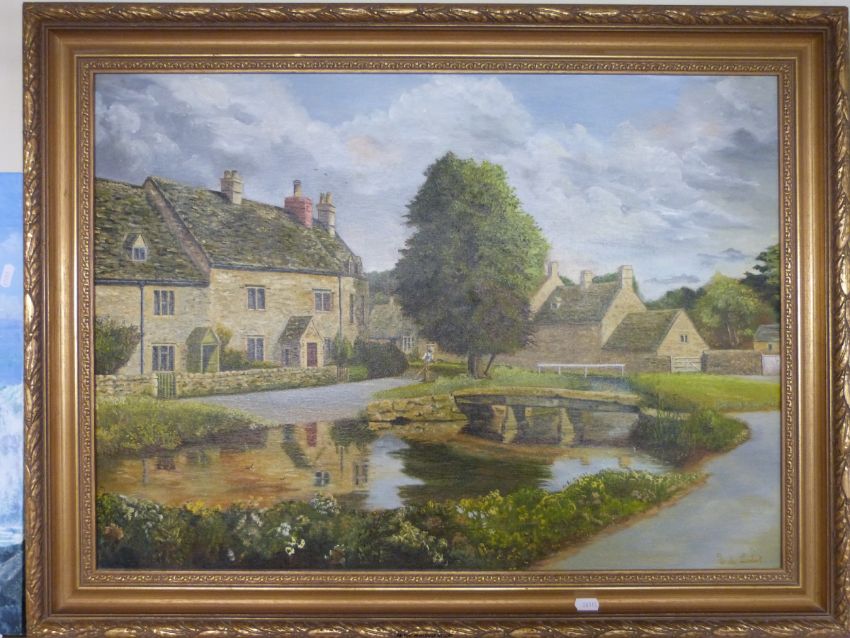 Ursula Lambert oil on board of Lower Slaughter (54 x 75cm)