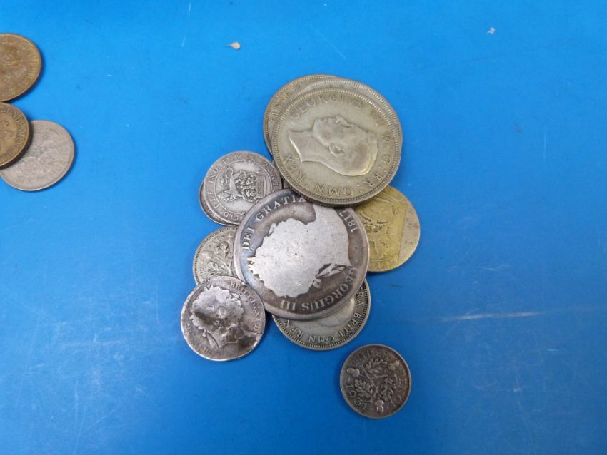 A collection of English pre-decimal and world coins etc, includes 76g of mixed silver George III onwards with a F-VF 1816 sixpence