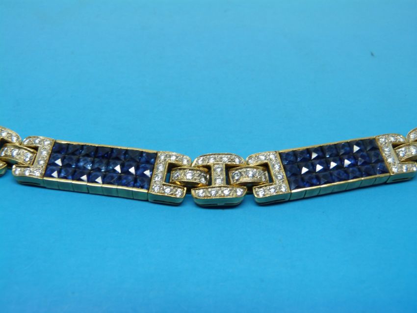 A yellow metal bracelet set with four panels of 21 square sapphires alternating with diamond encrusted square links