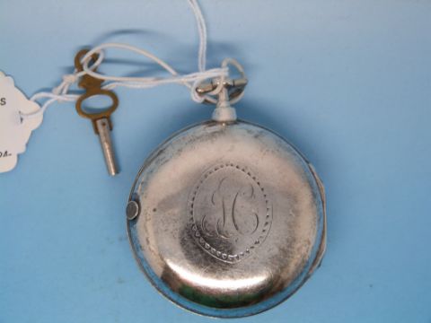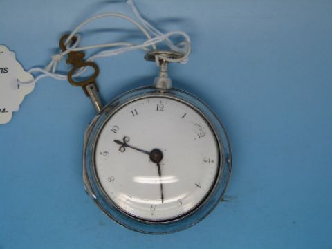 A Georgian silver pair cased gentleman's open face pocket watch with fusee movement and verge escapement, pierced and decorated balance cock signed Geo Moore London, the dial being enamelled with Arabic numerals with beetle and poker hands