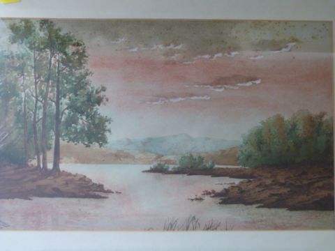 A pair of framed and glazed watercolours by H Fillery 1924 of rural lakesides at dawn (26cm x 41cm)