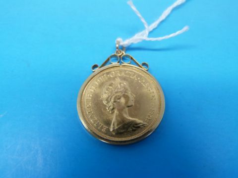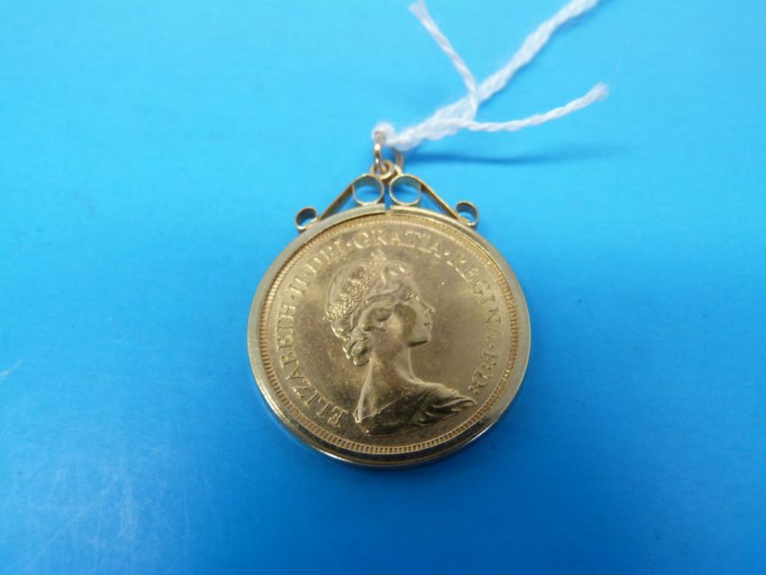 A 1976 gold full sovereign in 9ct gold mount (8.7g)