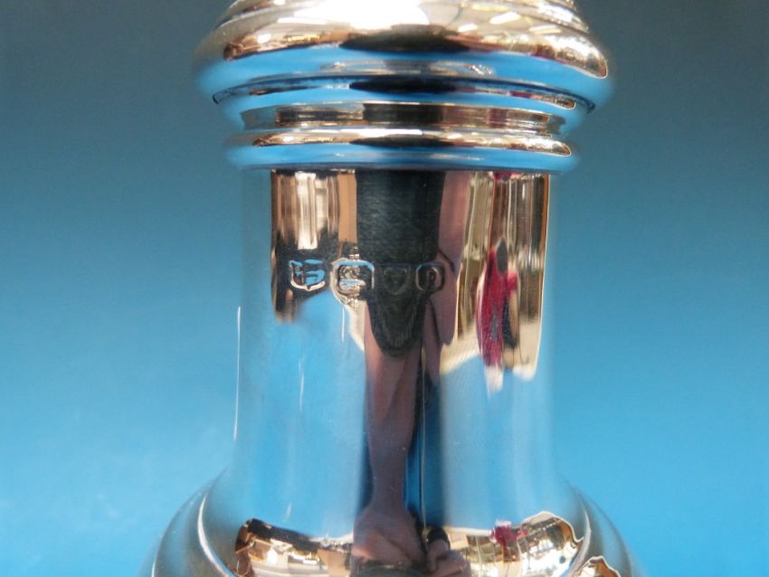 A hallmarked silver sugar shaker, Chester 1938. Height 24cm, weight 223g.