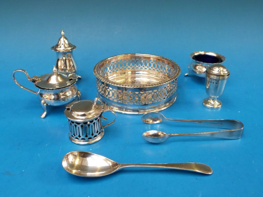 Five various hallmarked silver mustards, peppers etc together with a plated wine coaster, sugar tongs and a spoon