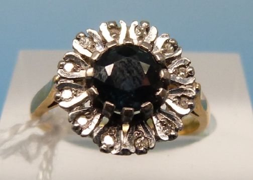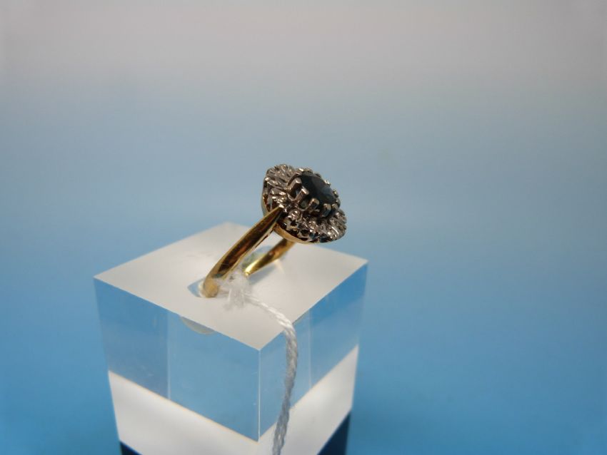 An 18ct gold ring set with a central sapphire surrounded by diamonds in a flower cluster (size L)