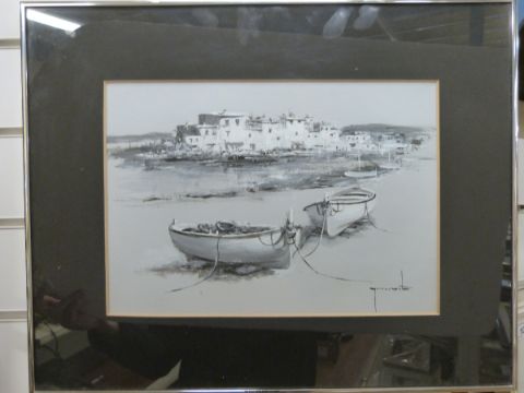 A gouache of beached boats in harbour (23 x 33cm)