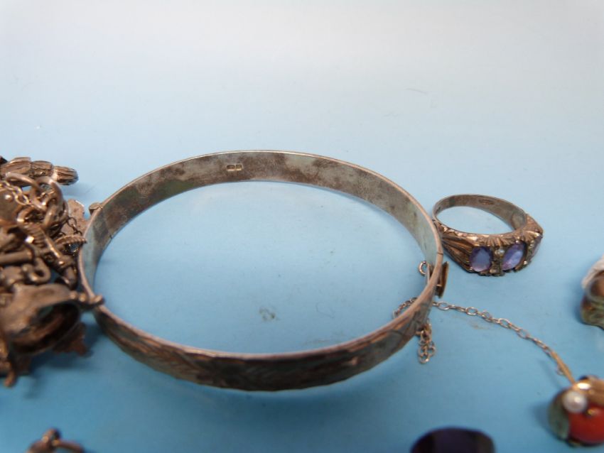A pair of 9ct gold earrings set with coral and a pearl, a gold tooth cap, hallmarked silver bangle, a hallmarked silver thistle brooch set with critrine and a purple stone, hallmarked silver ring set with amethysts and a silver charm bracelet with 20 white metal/ silver charms including a seahorse, woodpecker, rabbit etc