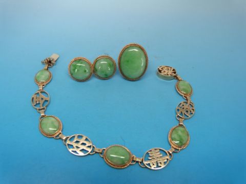 A yellow metal bracelet marked 375 set with jade and Chinese characters together with matching earrings and ring
