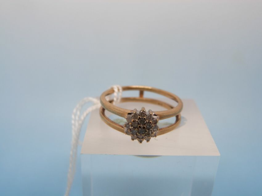 A 9ct gold ring formed of two bands set with diamonds in a cluster (size O)