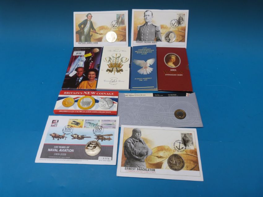 Ten commemorative coins in folders, some with first day cover stamps etc to include aviation, famous people, WW2 etc