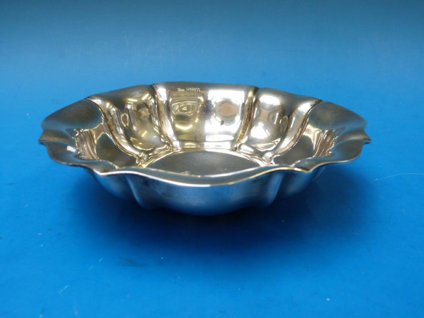 A hallmarked silver bowl with lobed edges, Sheffield 1914. Maker's mark HA, 17cm diameter, 250g