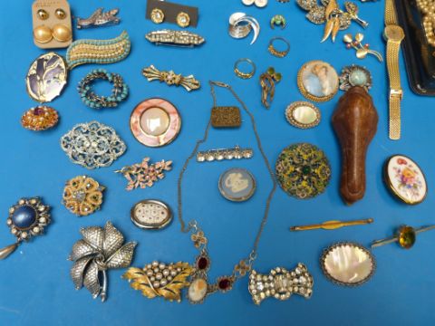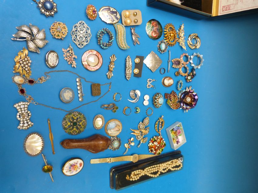 A quantity of costume jewellery including silver Wedgwood brooch, 800 silver brooch, sterling filigree brooch, silver ring, silver brooch set with citrine etc