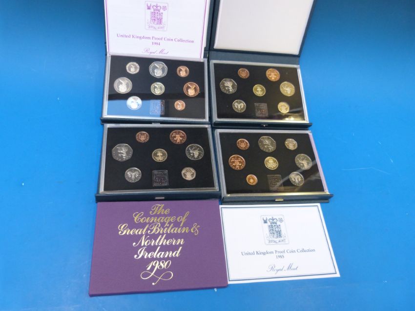 Four sets of Royal Mint cased proof UK coins comprising two for 1984 and two for 1985 together with a cased 1980 set