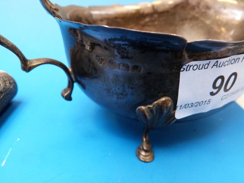 A hallmarked silver sauce boat (92g) together with a silver-topped dressing table pot, nail buffer, pusher and a spoon