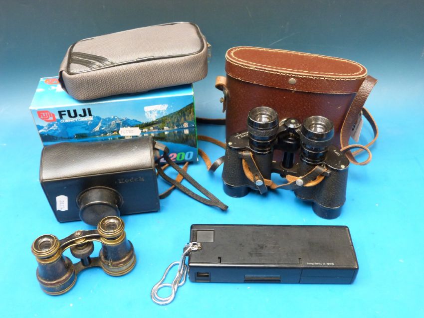 A pair of Lieberman & Gortz binoculars, a Fuji DL-200 camera, a Kodak camera etc