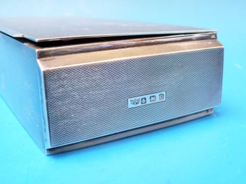 A Mappin & Webb hallmarked silver Art Deco engine turned cigarette box (B'ham 1938) 18cm long