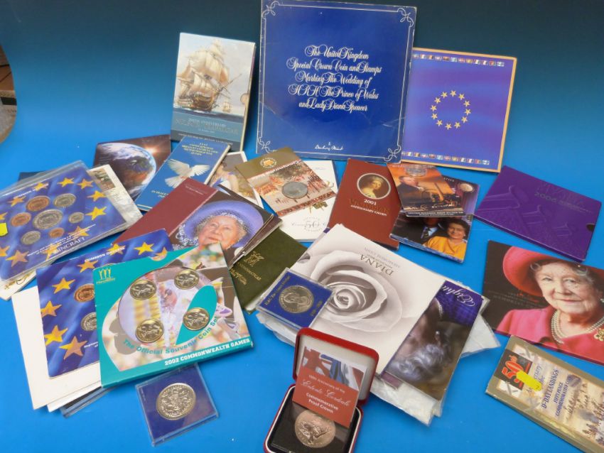 Approximately 35 largely royal commemorative coins in original collectors' packaging, some sporting and military examples, £5 coins etc