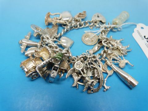 A silver charm bracelet with a large quantity of charms to include penguin, boat etc
