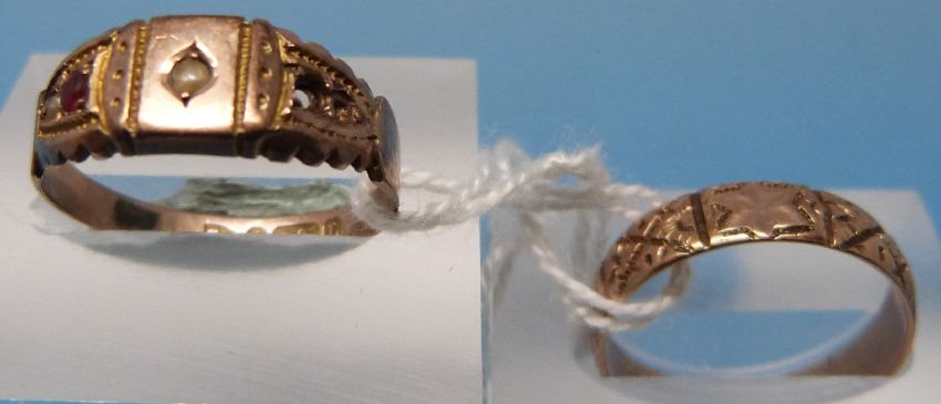 A 9ct gold wedding band (size L) together with a 9ct gold ring set with seed pearls, Chester 1894 (size N)