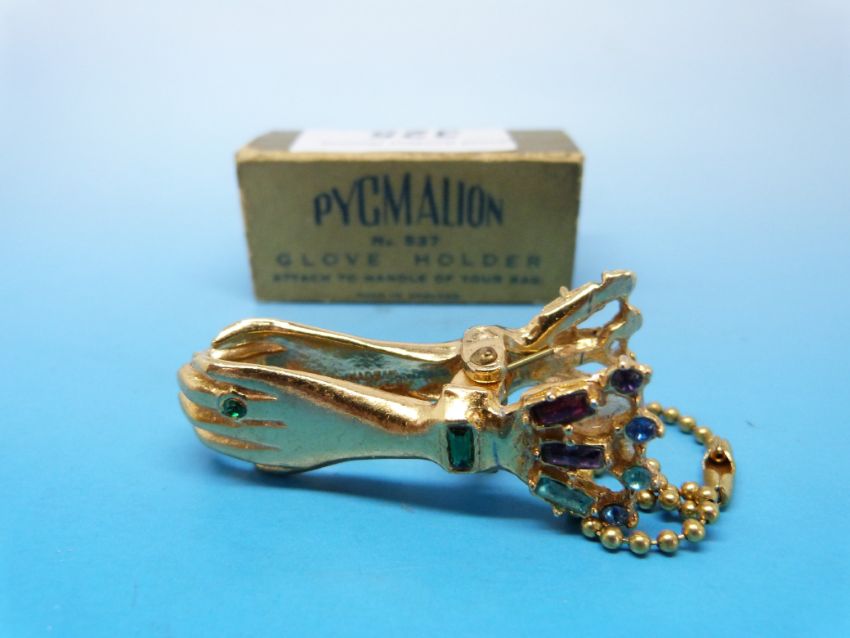A boxed retro Pygmalion glove holder / clip in the form a bejewelled hand
