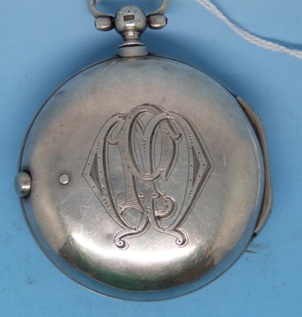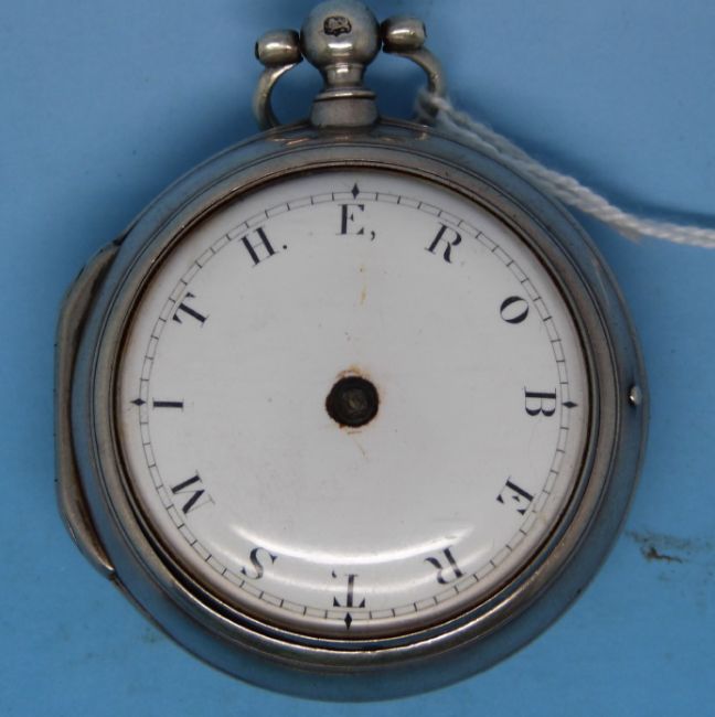 A gentleman's Georgian pair cased silver pocket watch (Ldn 1788) with fusee movement and verge escapement by P Portman, London. The balance cock is pierced and decorated with an urn and foliate design. The enamelled dial has the name "Robert Smithe", which substitutes the numerals