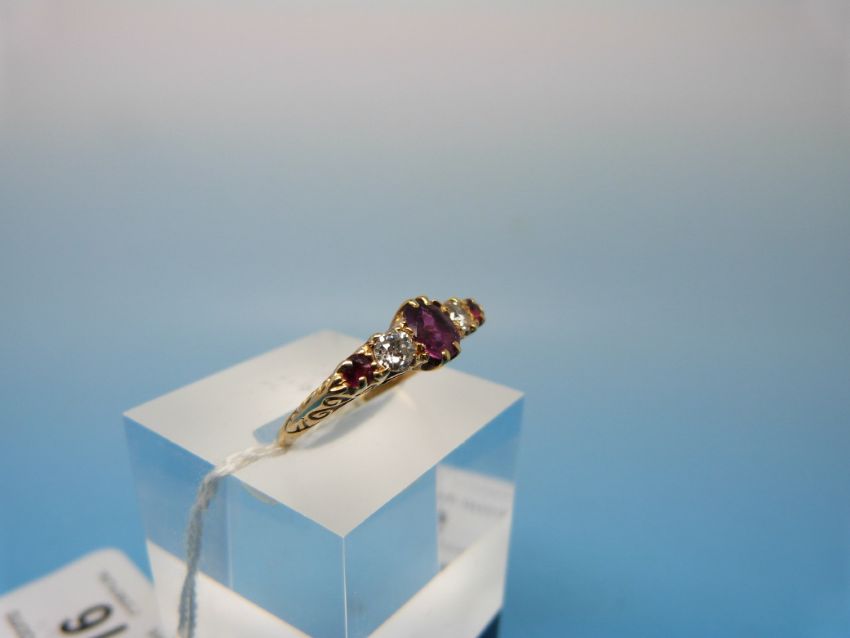 A 19thC yellow metal ring set with alternating rubies and diamonds in a floral setting, the central ruby measuring approx 0.58ct (size O)