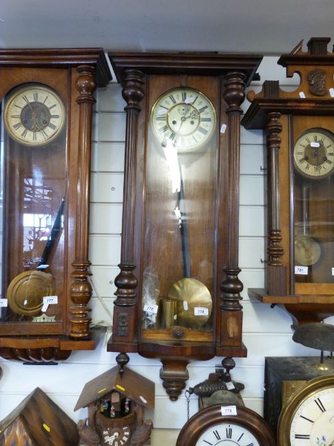 A two-train c1880 weight-driven Vienna regulator clock with ivory coloured enamelled dial and gilt chapter ring bezels, in a mahogany case with pillared carving