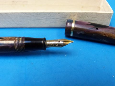 Conway Stewart Dinkie 540 pen, c1937, in rare peacock plumage with 14k nib. No clip or ball, tapering black top (no knurls)