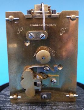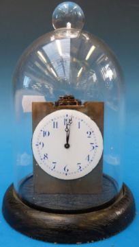 A small carriage clock movement, with blue Arabic numerals to dial, under dome