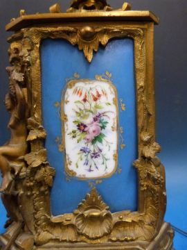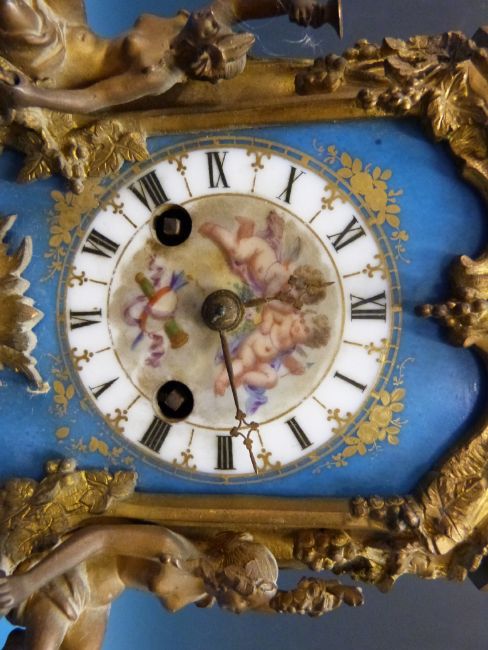 A French 19thC figural ormolu and porcelain clock on base with cherubs to dial. 3.890kg