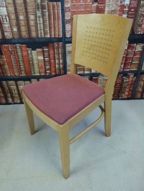 A set of six upholstered beech chairs with pierced shaped backs and bentwood stretchers