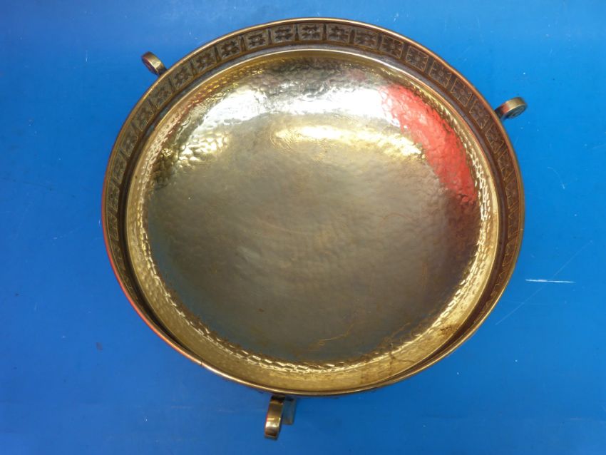 A rare WMF beaten brass Arts and Crafts fruit bowl raised on three shaped legs
