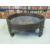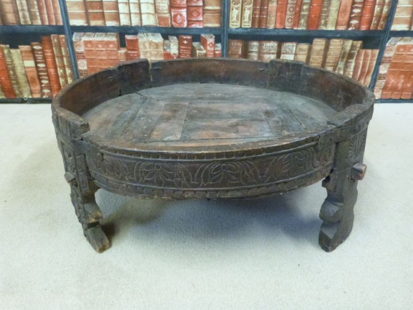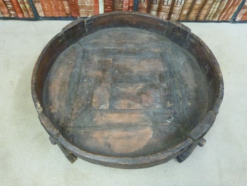 A carved and metal bound Eastern pedestal low table or large receptacle, 75cm diameter