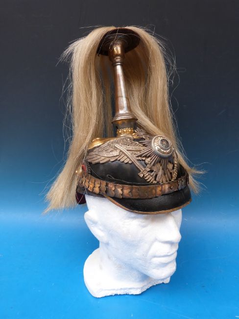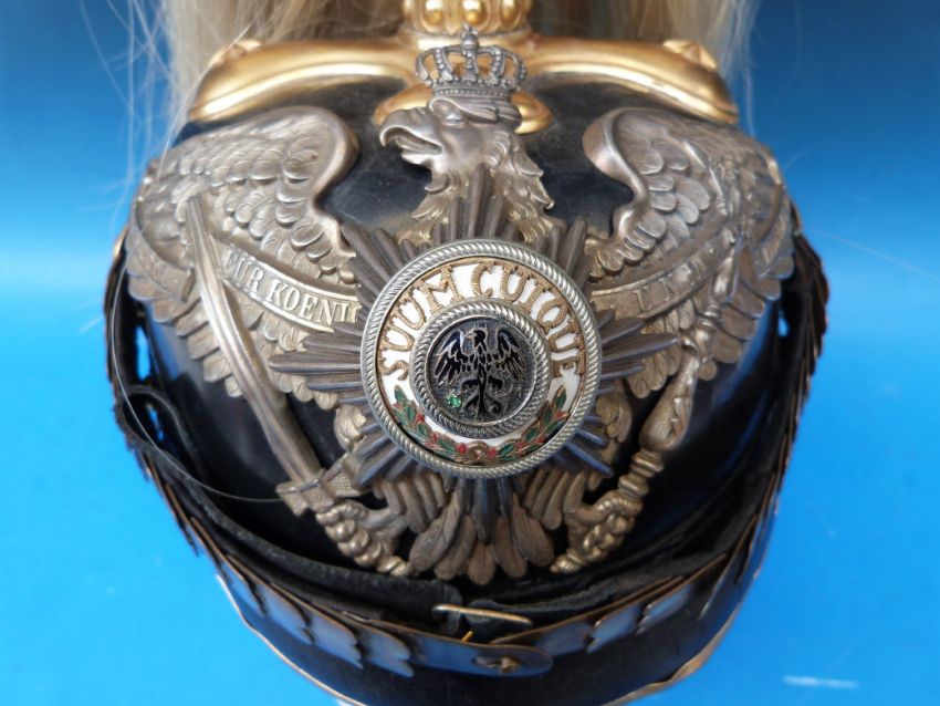 A WWI German officer's pickelhaube with enamel central medallion and Suum Cuique motto, the spike topped with horse hair (31cm)
