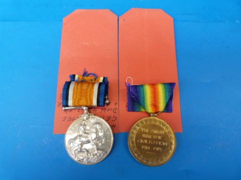 A pair of WWI Machine Gun Corps casualty medals awarded to 45535 Pte G E Hill, with research paperwork