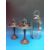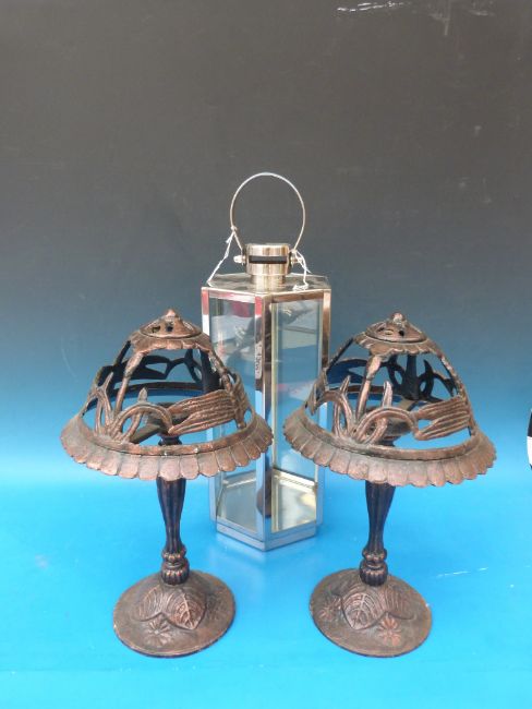 A pair of bronze effect cast candle holders and a contemporary glazed hanging storm lantern