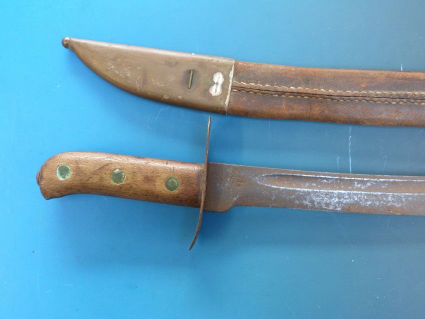 A late 19thC short sword stamped Hembrug with brass-mounted leather scabbard