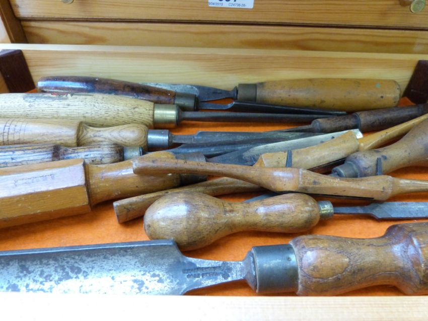 A tool chest containing approximately 60 Marples and other wood carving chisels etc, many stamped Purslow together with a particularly small compass rebate plane