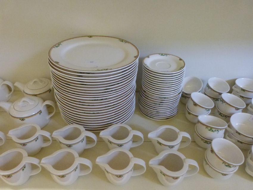A Villeroy & Bosch 'Adriana' dinner service with 12 place settings of a dinner plate, large bowl, cake plate, cup and saucer, milk jug, sugar bowl, finger bowl and four teapots (100 pieces in total)