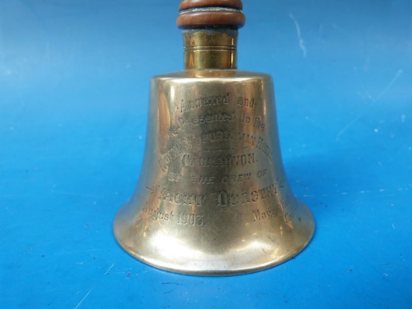 A brass bell dated 1903 and 1901 relating to the Royal and Sportsman Hotel Carnarvon, Yacht 'Dorothy' and the Irish contingent of the 3rd V. B. R. W.F (Welsh Fusiliers)