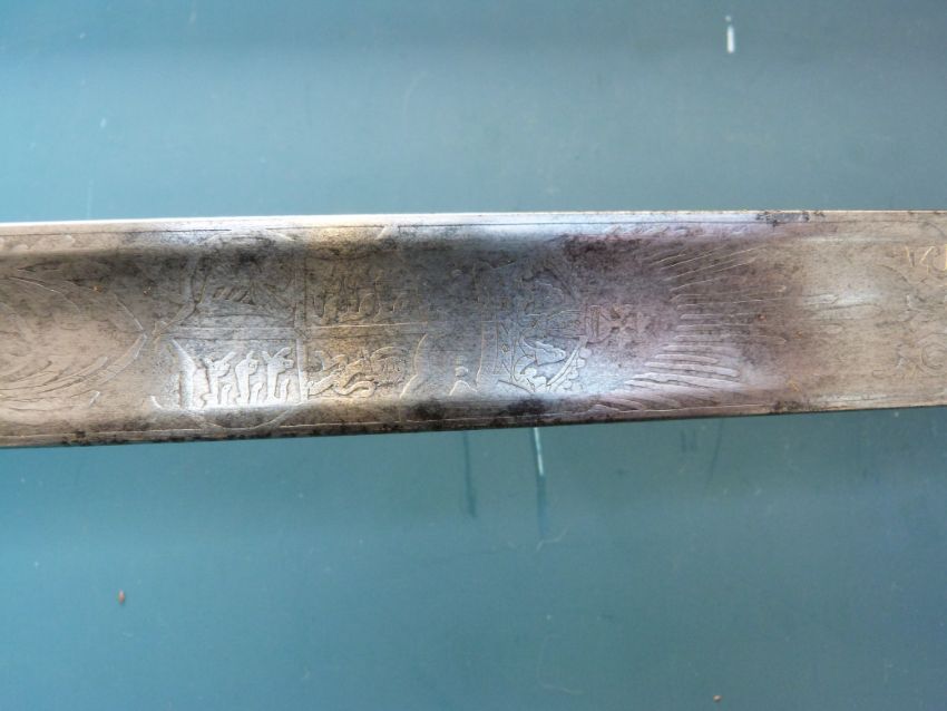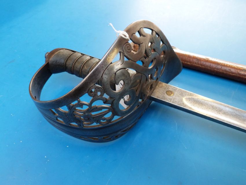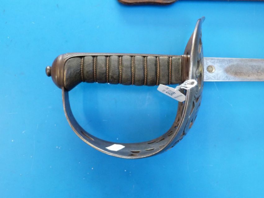 An 1895 pattern infantry officer's sword with VR cipher, possibly by Downie & Co of Newcastle, in leather service scabbard