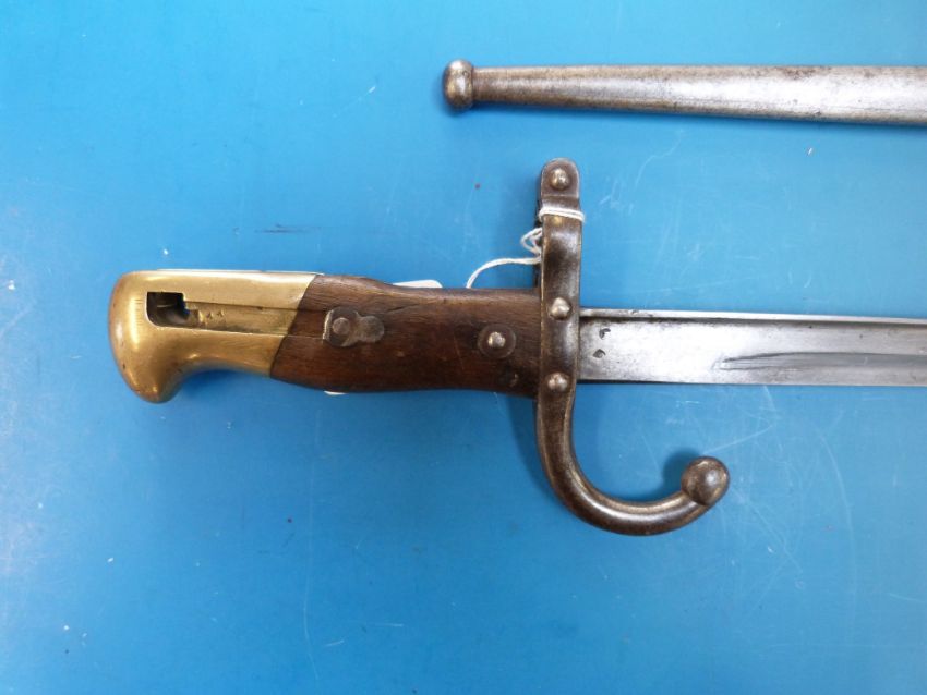 A French bayonet in scabbard with brass and wooden handle, the blade marked St Etienne 1878
