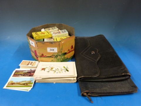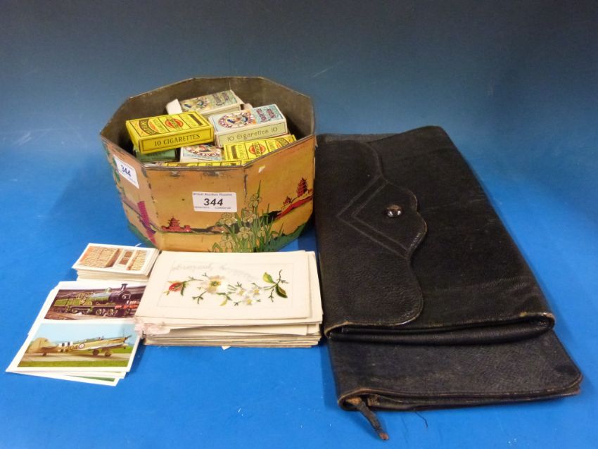 A collection of cigarette cards in boxes, WWI era embroidered silk cards and two vintage bags