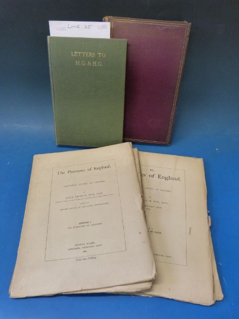 'The Pleasures of England' four separate lectures by John Ruskin together with further similar bound volume and 'Letters to M.G & H.G' by John Ruskin