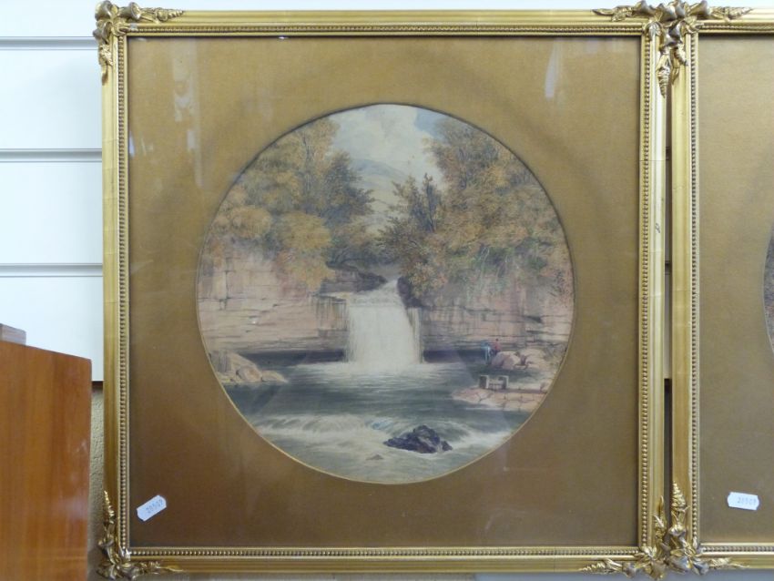 W Robinson: A pair of circular watercolours, one of figures beside a waterfall, the other a river under a bridge, signed and dated 1852. Both in ornate gilt frames